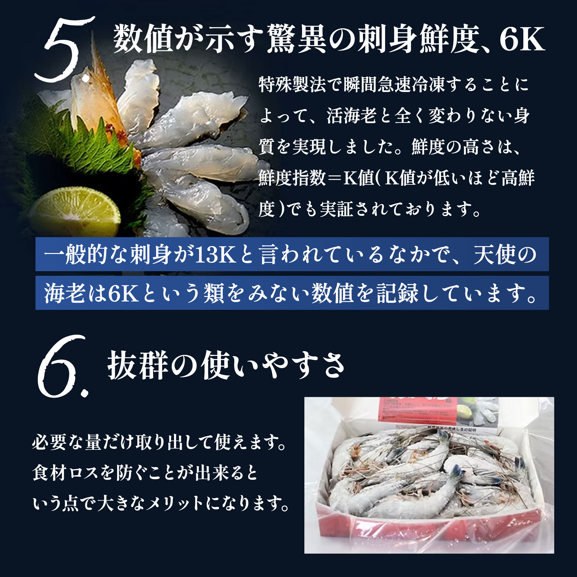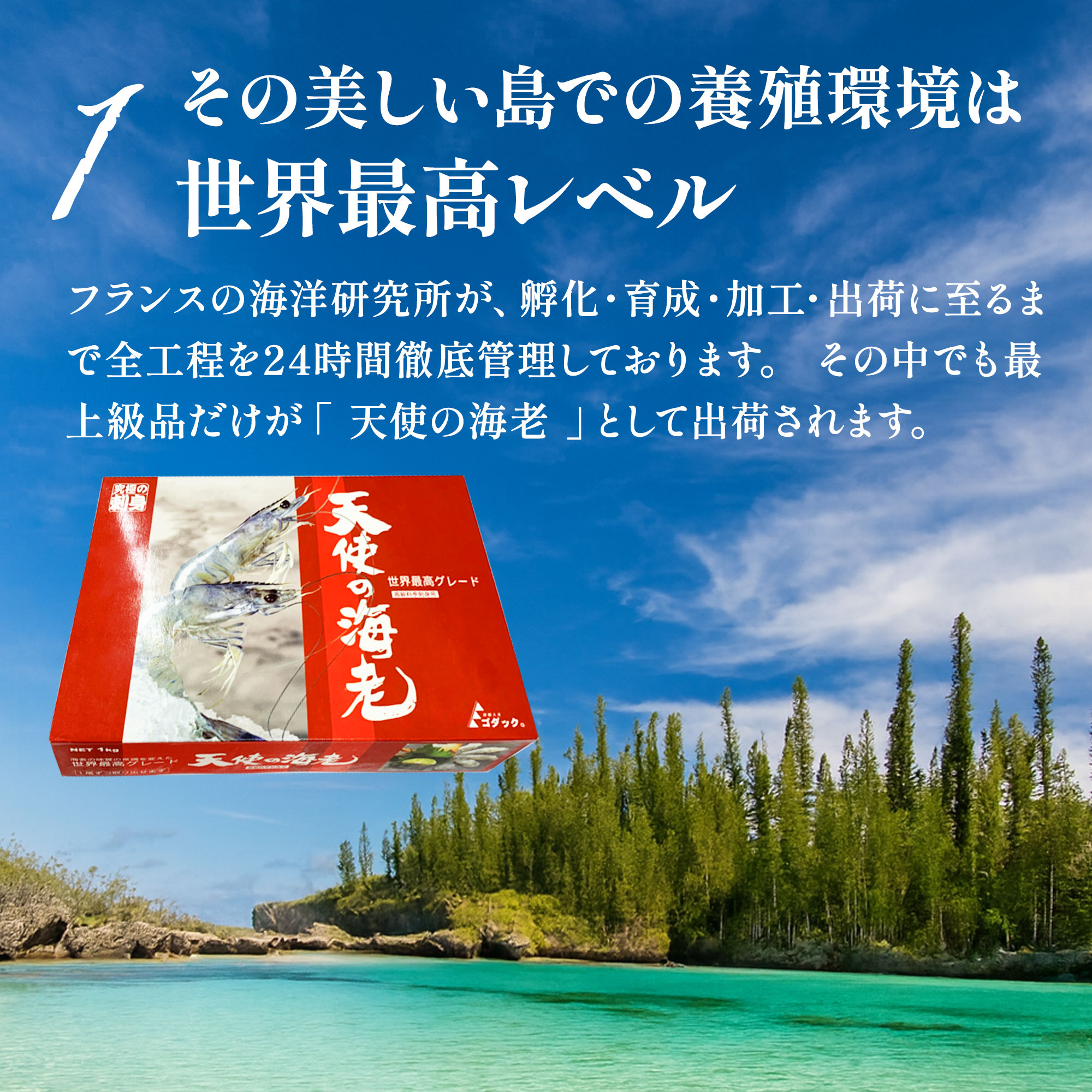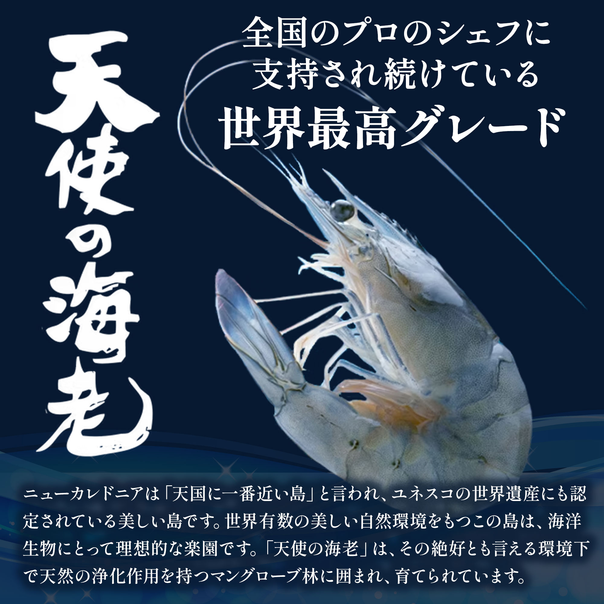 高級刺身用海老 徹底した衛生管理によりまったく汚染のない安全な海水、抗生物質不使用・餌は完全自然食で生育された、南太平洋に浮かぶニューカレドニア(プチ・フランス・・・ともいわれる)本当に美しい海やサンゴ礁に囲まれた島国。ニューカレドニア産の養殖エビは「天使のエビ(パラダイス・プロ-ン)」と呼ばれています。この海老は、フランス本国では高い品質ランクに位置付けらています。その理由は、一切の添加物を使用していないということ、水質や細菌検査を厳密に行い、高度の品質管理を行っている点にあります。活き海老だけをたった10分の瞬間急速凍結しているため活き海老と 変わらない身質を再現しました。身の引き締まった食感、癖のない上品な美味しさですので1度ご賞味下さい